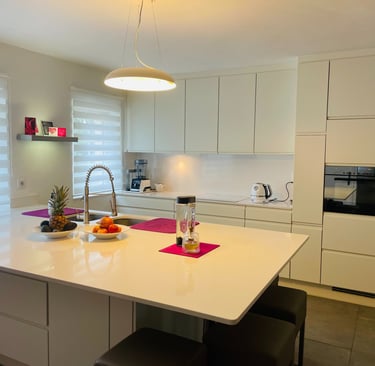The master house (approx. 250m2), built on two levels, radiates energy, true freedom and serenity . The play of light, the comfy volumes and open living spaces with contemporary design - living room and dining room (60m2), semi-open kitchen, air-conditioned master suite with dressing and bathroom, 2 bedrooms and 1 shower room, office space, summer kitchen - create a gentle harmony, favouring a southern rhythm of inside-outside living . A utility room, laundry room and cellar complete the ensemble.